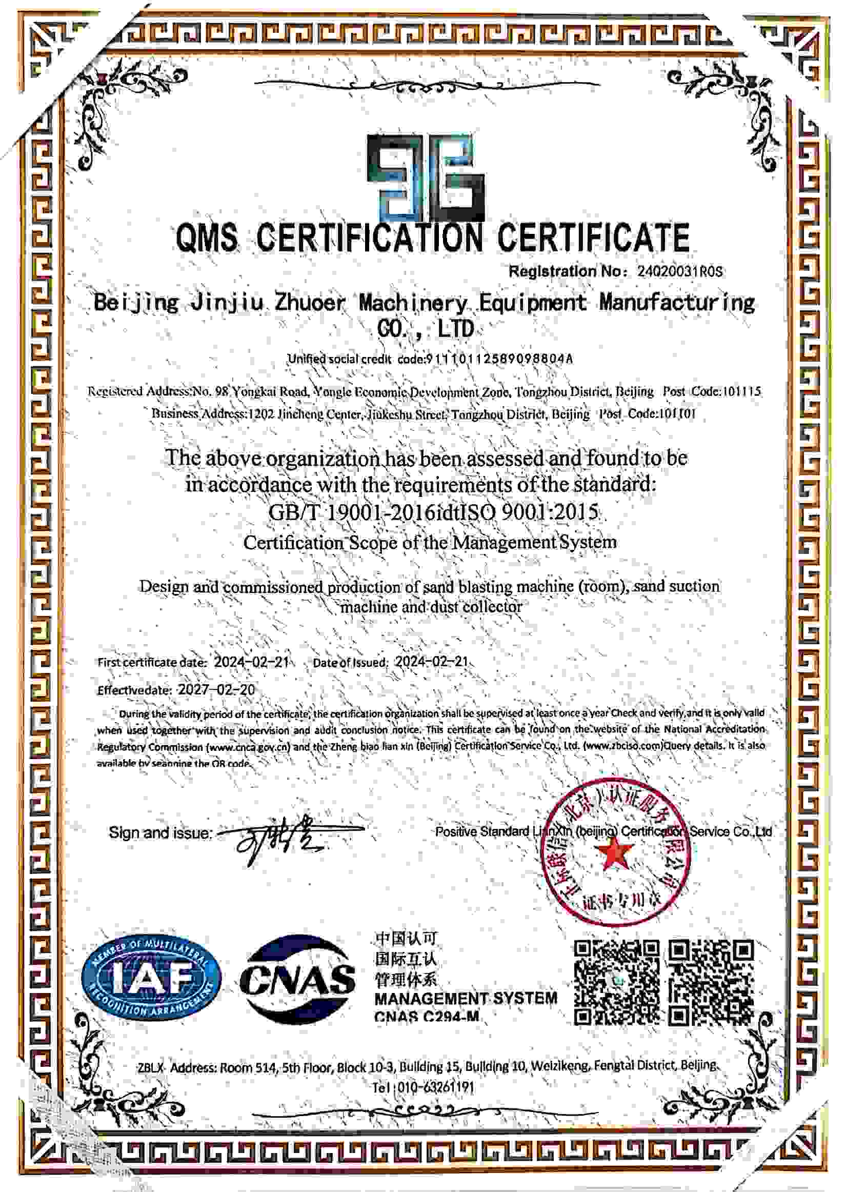 質量管理體系認證證書