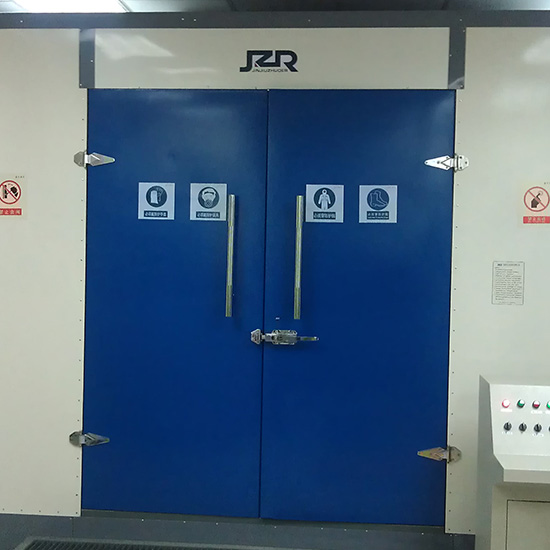 室 體?:室體外壁采用巖棉復合保溫板,內部使用耐磨橡膠板,確保在噴砂過程中保護室體不受損壞。室體兩側設有對開式大門,頂部設有進風百頁窗和消聲裝置?